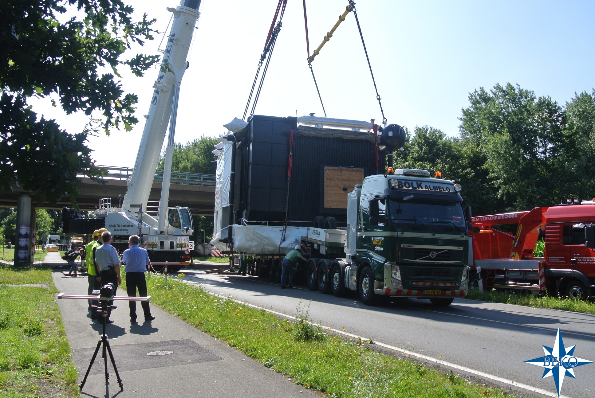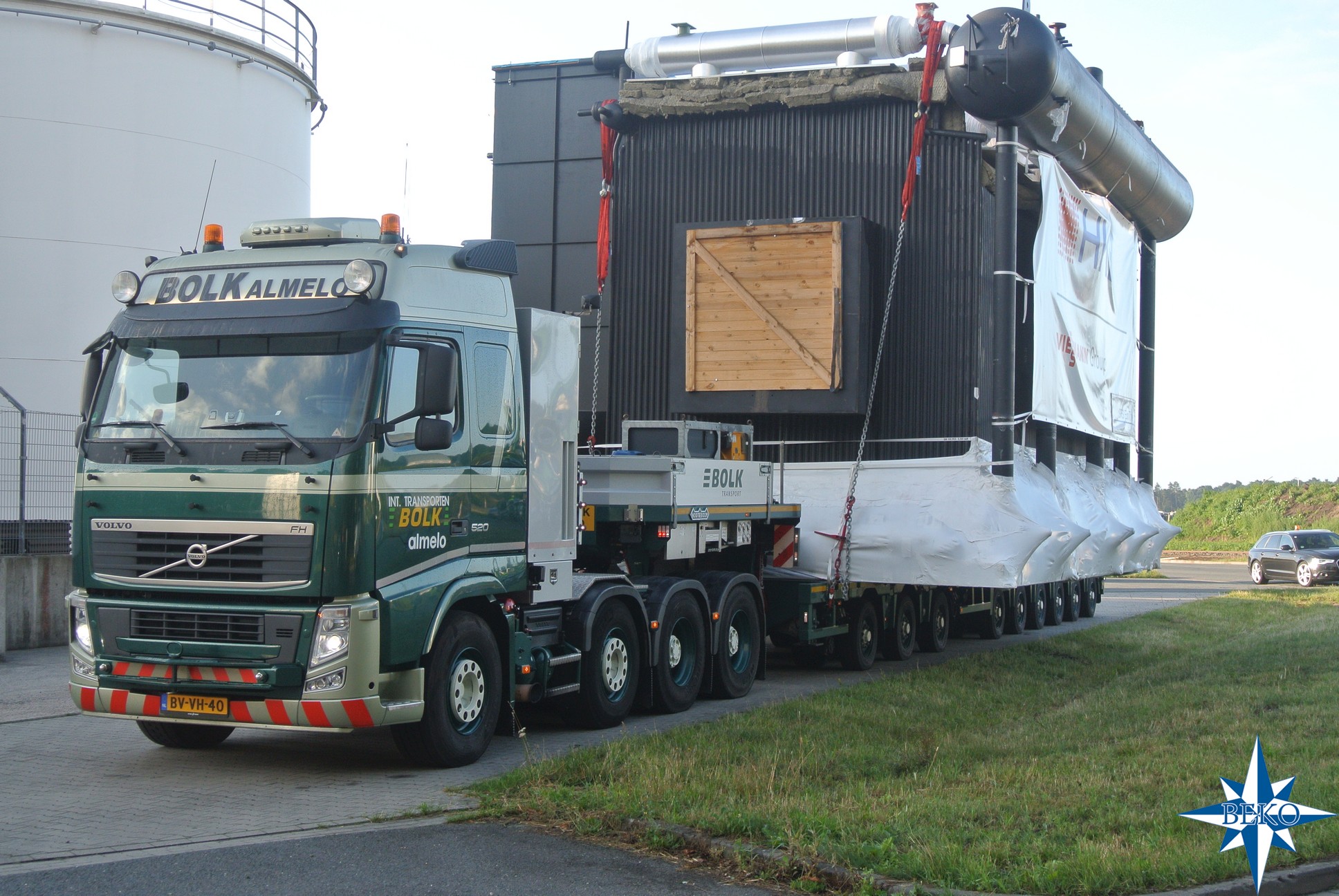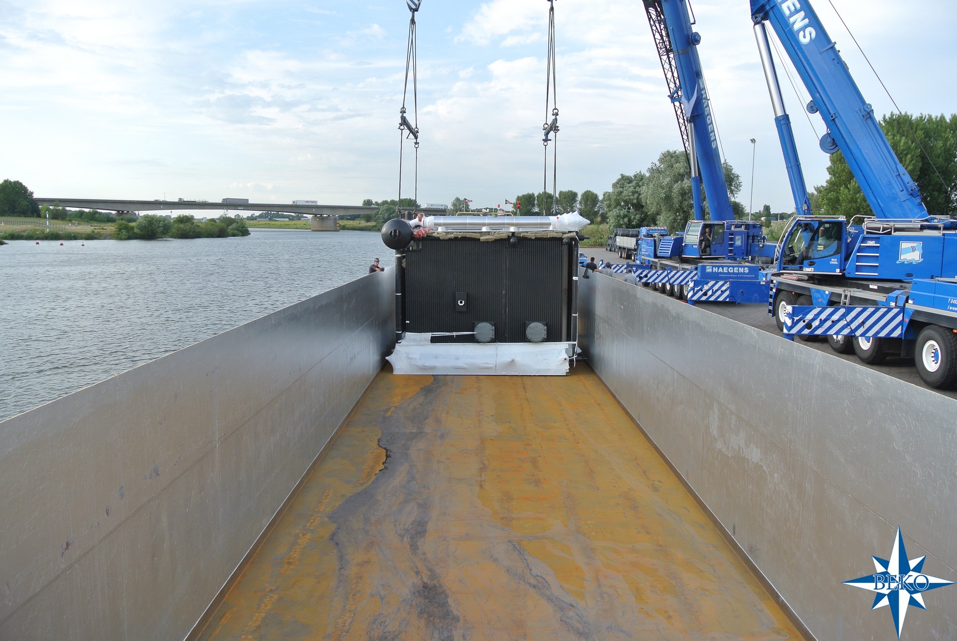 Voor een van onze regelmatige klanten mochten we het transport verzorgen van een ketel met afmetingen L x B x H 10.05 x 7.73 x 6.30 mtr . Het binnenschip moest geballast worden voor vrije doorgang van de kanalen. Na lossen in de haven van Spelle in Duitsland ging het verder per dieplader. Hiervoor moest 2 x een rijksweg worden afgesloten en een viaduct om het transport doorgang te laten vinden