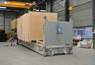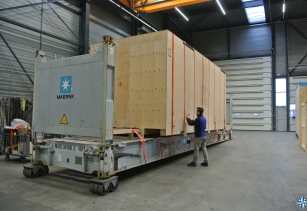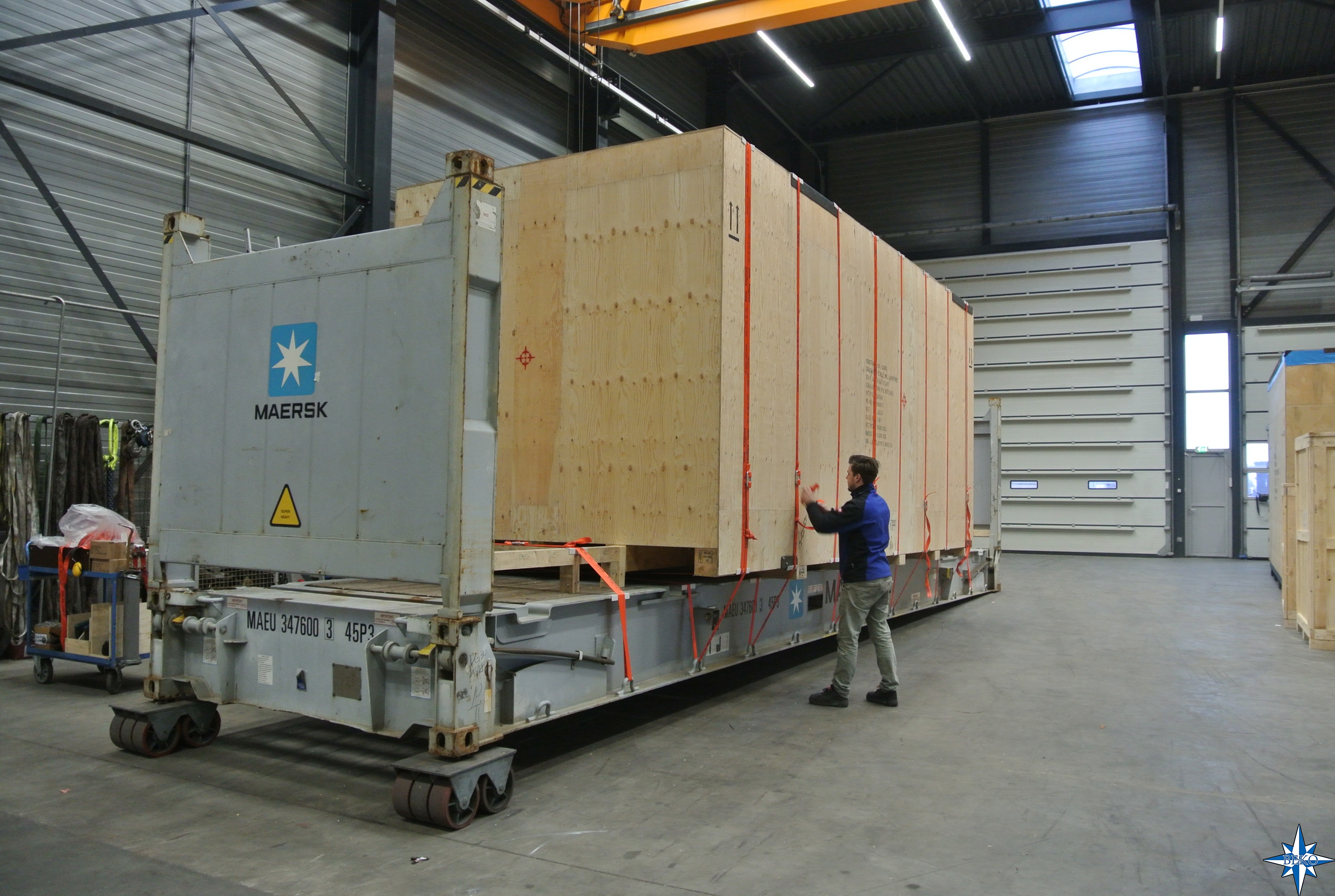 Afgelopen vrijdag een kist van L x B x H 6.90 x 2.95 x 3.05 mtr met een gewicht van 14 ton afgehaald in Duitsland en getransporteerd naar de overslag locatie.