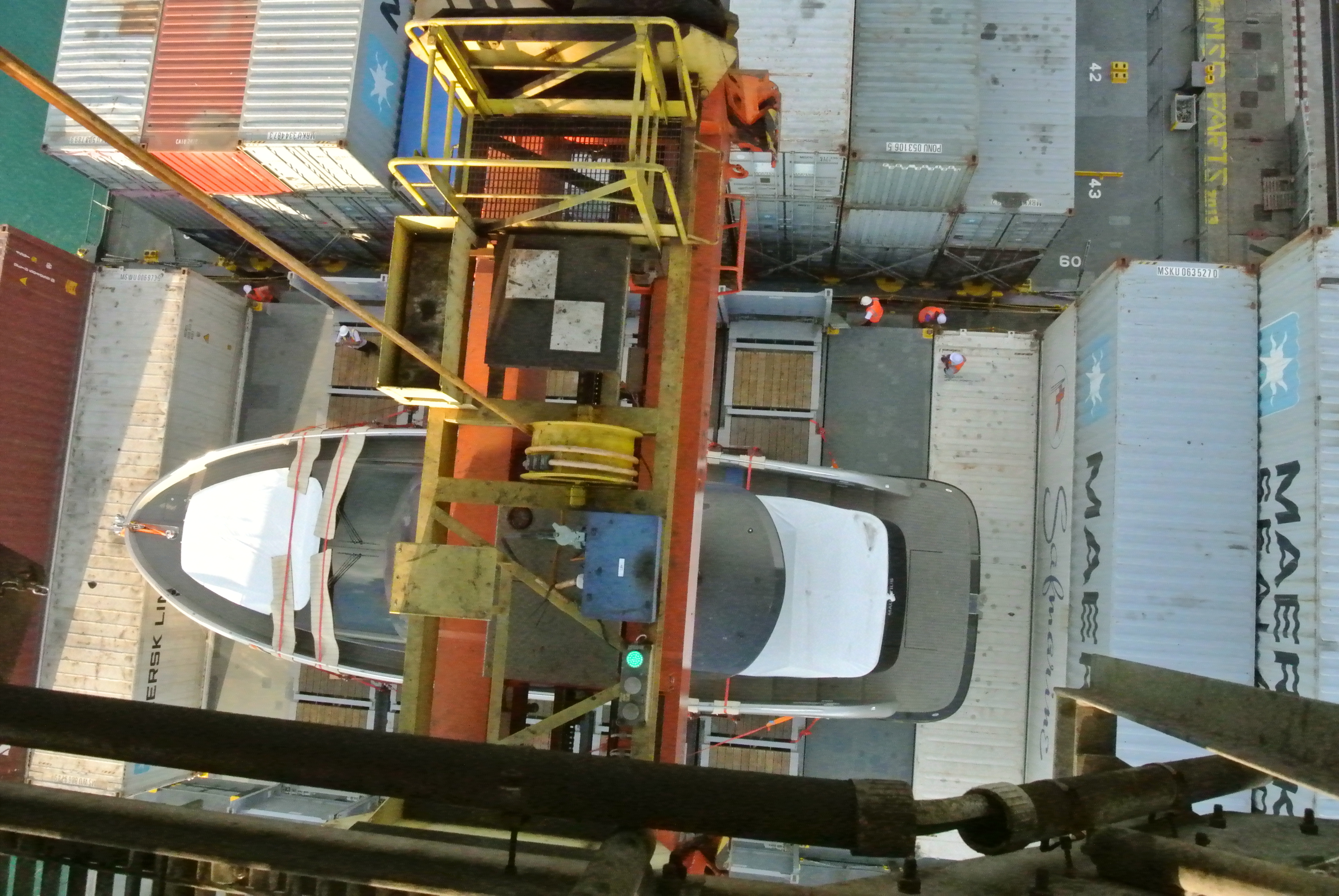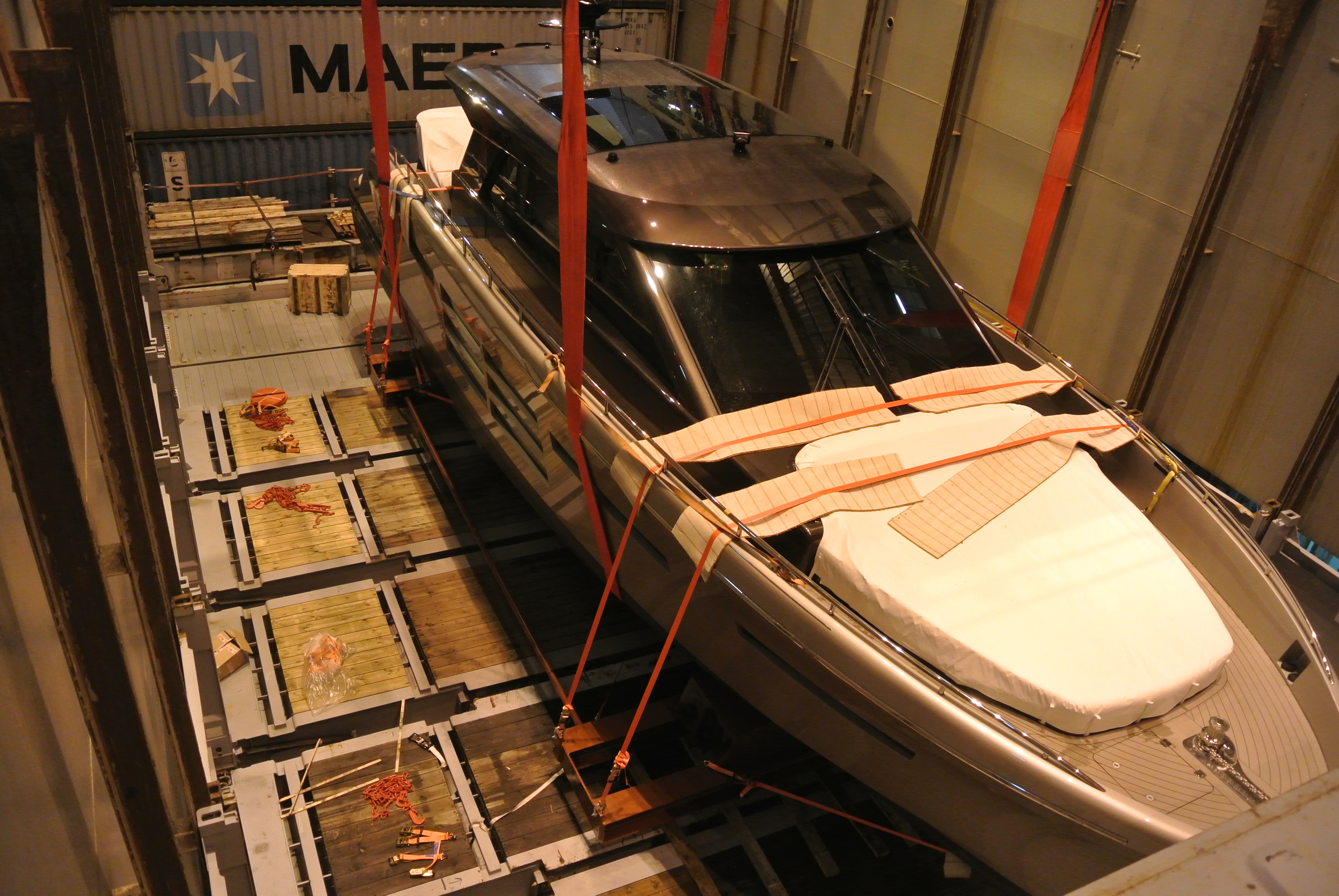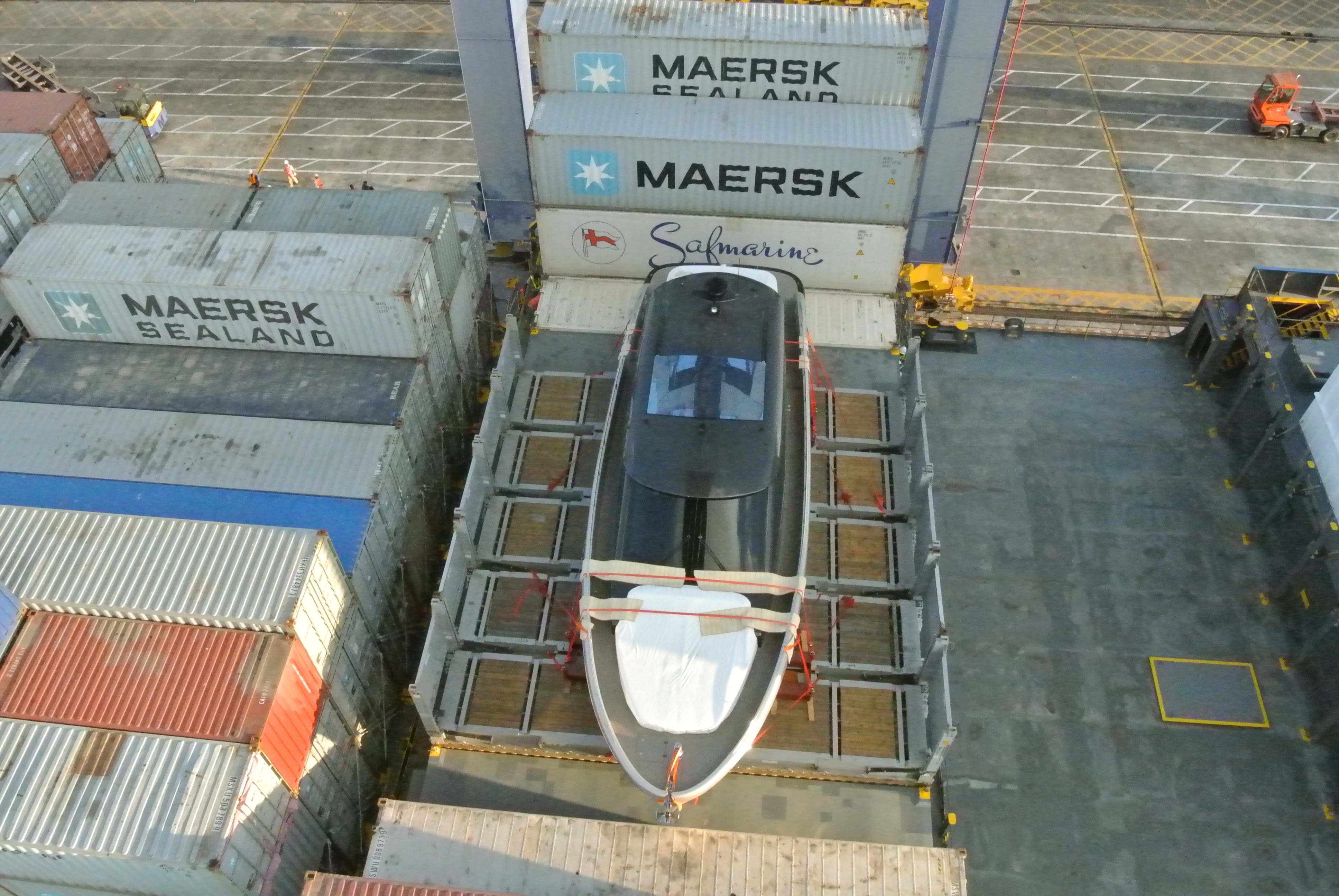 Vanaf Rotterdam naar Mauritius, het jacht werd vervoerd per containerschip.